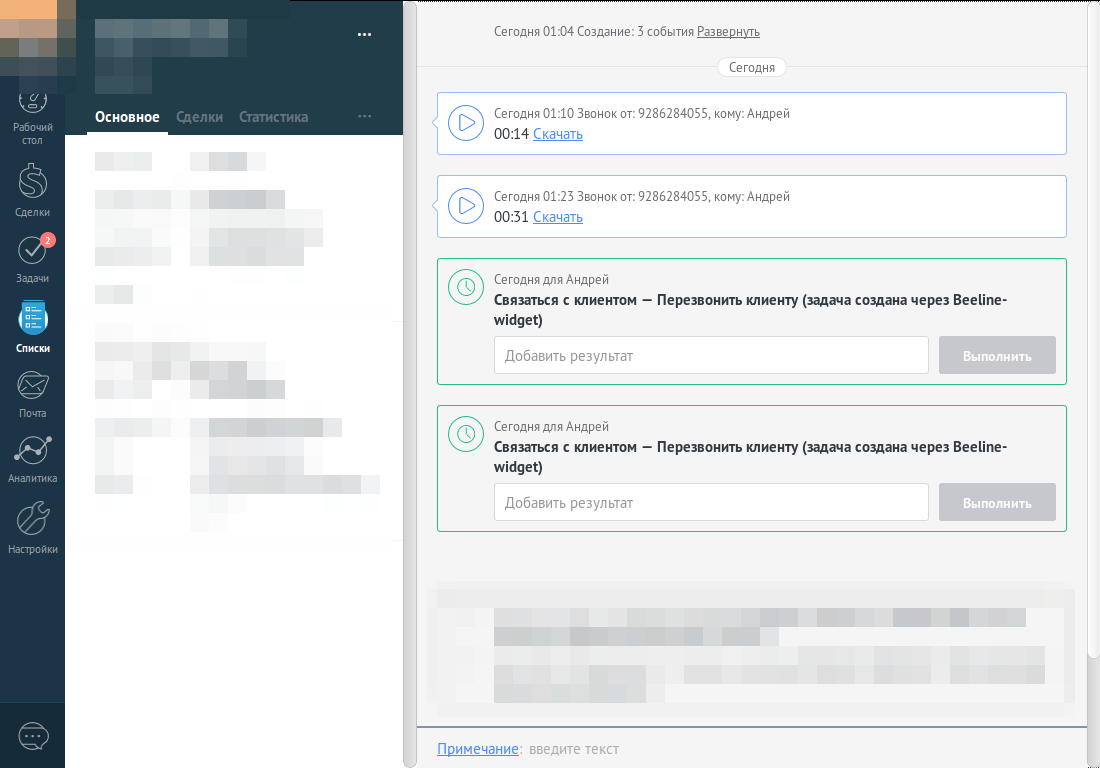 Была интегрирована телефония «Билайн АТС», которая стала отправной точкой для автоматизации коммуникаций. Это позволило существенно упростить рабочий процесс и обеспечить бесперебойную связь с клиентами, что в конечном итоге привело к сокращению времени на обработку входящего звонка.